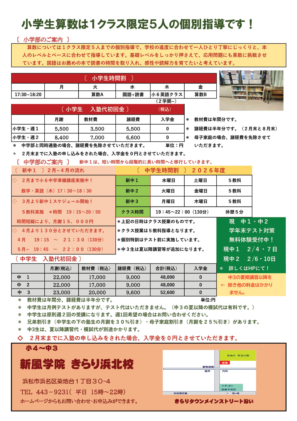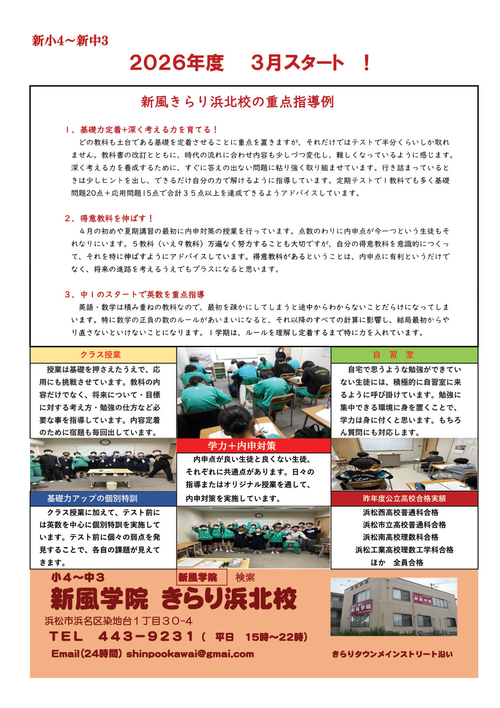 TOP >  きらり浜北校からのお知らせ >  2026年度 指導案内・カリキュラム・生徒募集について掲載させていただきます。